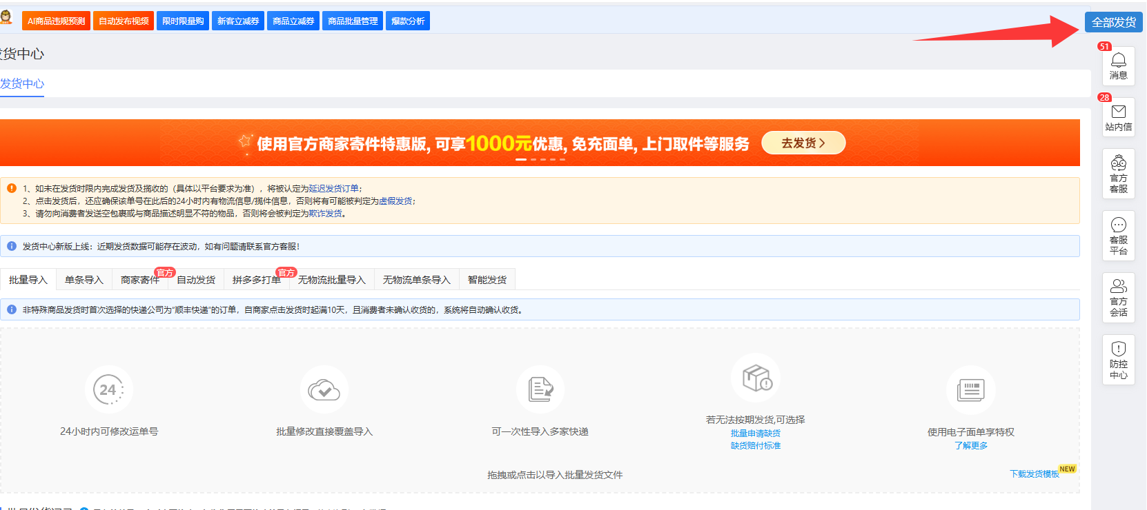 添加之后打开发货中心有个全部发货按钮,下方可以单页展示200个订单这样比较快